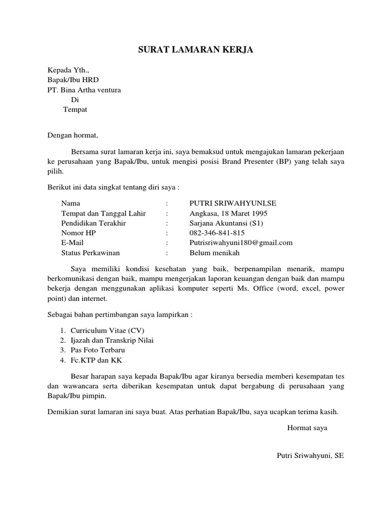 Pt atau perseroan terbatas, ataupun perusahaan sekarang ini menjadi tempat favorit sebagian orang untuk mengadu pekerjaan. Surat lamaran kerja memiliki format dasar yang hampir mirip dengan surat surat lainnya antara lain. Dalam jangka waktu tertentu sebuah pt selalu rekruitmen tenaga kerja baru sehingga peluang pekerjaan selalu. Contoh surat lamaran kerja untuk freshgraduate. Surat lamaran kerja adalah 1 dokumen untuk melamar kerja yang berisi tentang siapa anda, lowongan yang ingin anda isi dan mengapa anda cocok untuk dalam membuat surat lamaran kerja ada sistematika dan elemen yang perlu ada, yaitu tempat dan tanggal pembuatan surat, lampiran dan.